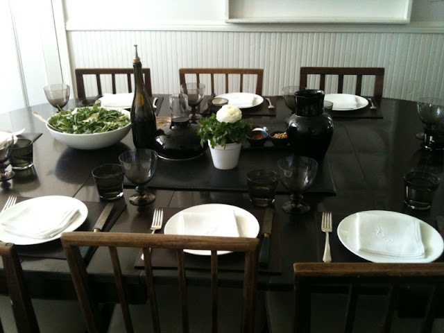 love using shades of brown and black with crisp white plates and linens on a formal mahogany table...a friend brought a white ranunculus in a white pot, which was the perfect thing for the table...dark brown leather placemats, vintage brown stemmed glasses mixed with brown tumblers from ikea, serving pieces and plates from jasper conran for wedgwood look good with the polished silver forks and vintage wood handled knives... a frittata, herb roasted potatoes, arugula salad and carafes of red wine, and it's ready for friends to settle in for a relaxed afternoon !